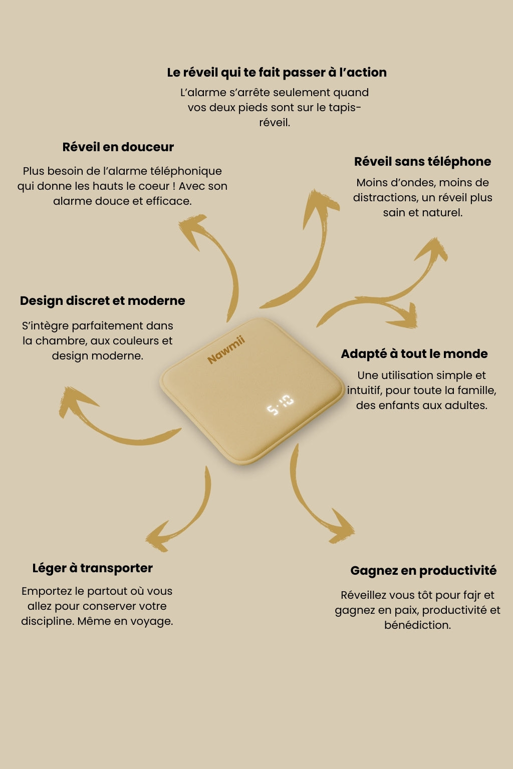 Plus besoin de garder ton téléphone sur la table de chevet. Le tapis devient ton réveil indépendant, loin des distractions et des ondes néfastes pour le cerveau.